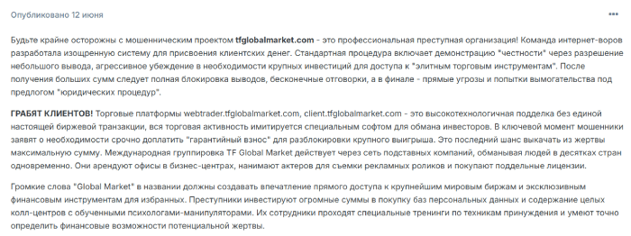 Да и отзывы о TF Global Market дают четкое понимание того, что перед нами наглые мошенники и, основной их задачей является кидалово простого населения. Именно поэтому стоит понимать, что сотрудничество с организацией к чему-то хорошему не приведет, а только заставит потерять свои средства. Таких мошенников есть очень много и, работать с ними не стоит, да бы не стать жертвой обмана.