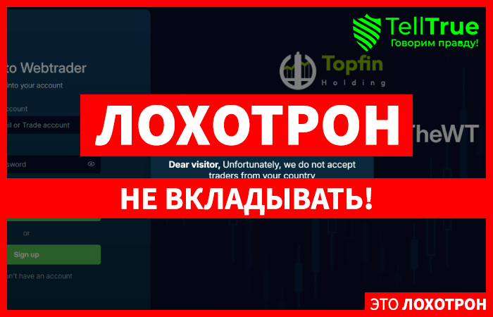 Примером лжеброкера, продвигающего себя с целью выманивания финансов, является проект Topfin Holding. Созданный мошенниками проект позиционирует себя, как надежную и престижную организацию, что обслуживает на прозрачных условиях клиентов, но прописки, как и лицензирования у организации нет.