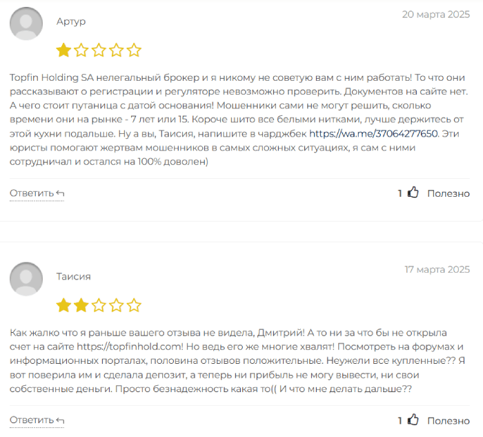 Человеку будут показывать красивую картинку, пока он вносит депозит, а дальше просто сольют средства и даже не станут ничего объяснять. Вывести деньги с Topfin Holding клиенты однозначно не смогут, именно поэтому данную организацию лучше обойти стороной. Такие мошенники, как рассматриваемый брокер, ничего хорошего дать клиентам не могут и не собираются.
