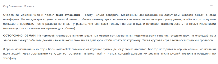 Внимательно читая отзывы о Trade Swiss и сотрудничестве с проектом, можно сказать лишь о том, что перед нами типичные мошенники, что кидают простых людей. Именно поэтому связываться с подобными проектами категорически не стоит, поскольку результатом взаимодействия с ними станет потеря финансов.