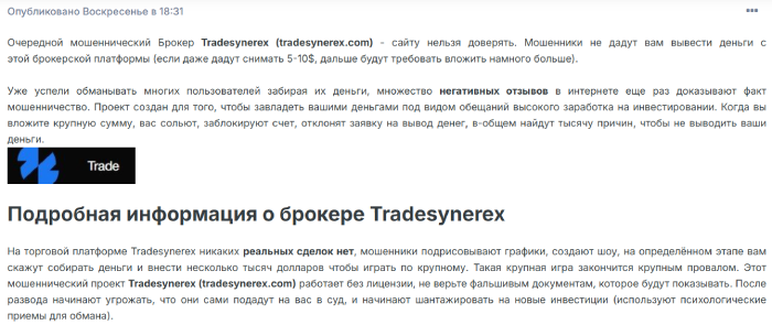 Если внимательно читать отзывы о Tradesynerex, то можно еще раз убедиться, что перед нами наглые мошенники и, они обманывают простое население. Именно поэтому стоит подальше держаться от брокерского лохотрона и ему подобных проектов. От сотрудничества с такими мошенниками толку не будет, а материальные потери ждут пользователей колоссальные.