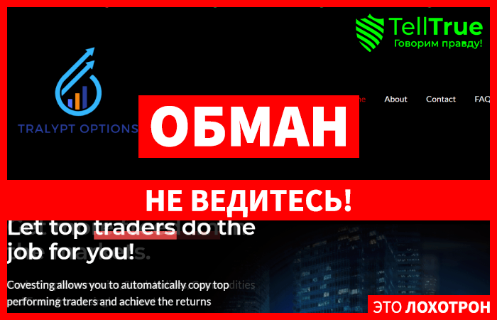 Перед нами типичные мошенники, что кидают простых людей и, вывести средства с Tralypt Options точно нельзя. Перед нами мошенники, что обманывают простое население и, с ними работая пользователи просто останутся с пустыми карманами. На липовом терминале этого проекта имитируются торговые процессы и, доверяя этому, люди теряют все.