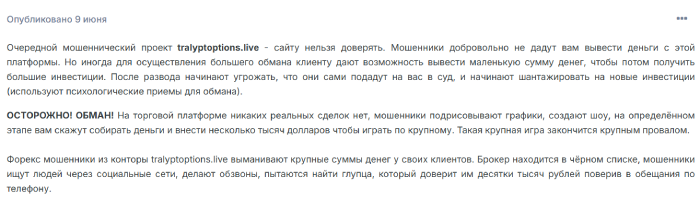 Читая отзывы о Tralypt Options и работе проекта, сказать можно лишь о том, что реально перед нами мошеннический проект, созданный для выкачивания средств. Таких проектов с каждым днем становится только больше в сети и все они пытаются произвести хорошее впечатление на пользователей, да бы уверенно кинуть их.