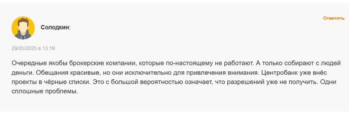 Адресные данные на сайте указаны некорректные, других внятных контактов нет. у брокерской компании отсутствует разрешение финансового регулятора на деятельность и, именно поэтому сотрудничество с проектом не может иметь хорошие последствия. Кухонный принцип работы брокера предполагает процесс игры против клиентов, то есть, наглый и циничный слив депозитов.