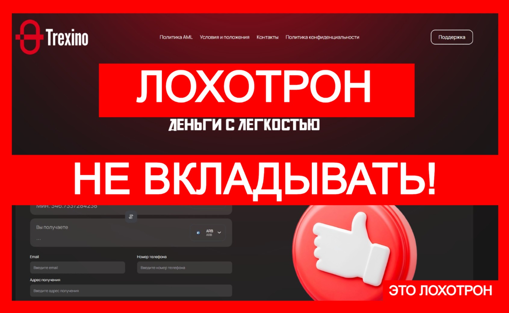 Сайт trexino.com на деле представляет собой стандартный шаблон, который уже успел стать классикой среди лжеобменников. Все знакомо: минимум уникальности, максимум воды. Дизайн — копипаста, функциональность — на уровне самых простых конструкций. Видно, что делали быстро, без желания вложиться. А зачем им стараться, если проект — откровенно временный? Главное — собрать побольше денег и исчезнуть, пока не поймали.