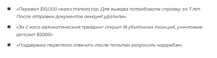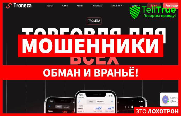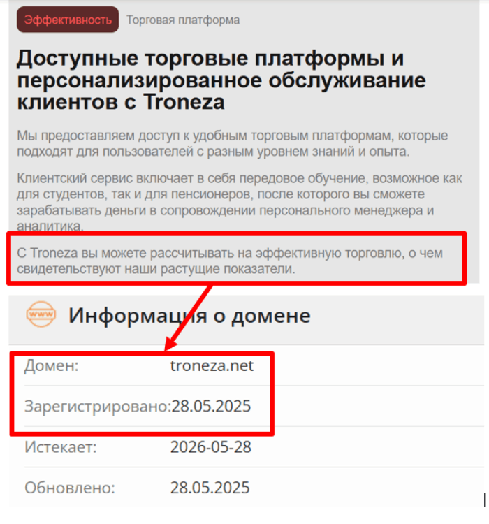 Мошенники брокеры активировались ни на шутку. Один из таких лохотронов пишет на своем официальном сайте «Доступные торговые платформы и персонализированное обслуживание клиентов с Troneza», активно привлекая внимания простых людей. Лжеброкер Troneza (troneza.net) пытается позиционировать себя в роли надежной и проверенной компании, обманывая простых людей, так что организацию эту стоит запомнить, да бы обойти ее стороной и не потерять финансы.
