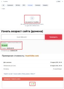 Но давайте разберемся детальнее. Начнем с самого сайта. trust-bite.com выглядит как стандартная биржа, но стоит проверить его историю, и правда всплывает наружу. Оказывается, проект зарегистрирован совсем недавно, всего 28 дней назад. Как тогда он может похвастаться многолетним опытом? Вероятно, те, кто стоят за этим проектом, решили не заморачиваться. Да и это видно по стоимости веб-ресурса в 4 рубля.