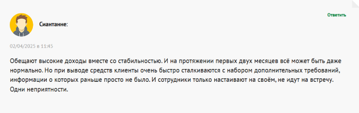 Рассмотренный нелицензированный брокер однозначно попадает в черный список. Именно поэтому сотрудничество с организацией к чему-то хорошему привести не может, ведь из-за конторы люди потеряют свои средства.