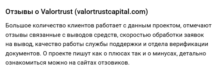 Если говорить об отзывах о Valortrust и работе проекта, то комментарии клиентов являются негативными, соответственно стоит бежать от этих мошенников, пока не поздно. У подобных брокеров потерять средства можно максимально быстро, а вот вернуть финансы от таких мошенников практически нереально. Именно поэтому все компании перед сотрудничеством стоит проверять максимально внимательно, да бы не попасть на обман.