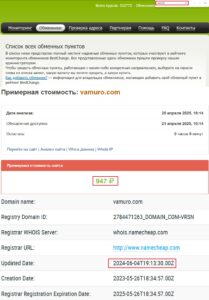 Теперь давайте немного про возраст проекта. Vamuro существует с 26 мая 2023 года, но его реальная деятельность началась лишь 4 июня 2024. Вы действительно верите, что менее чем за год можно построить надежный, уважаемый криптообменник? Мы — нет. Да и кто поверит, когда стоимость самого домена равна всего 947 рублей. Ну серьезно, что можно ожидать от площадки, которая даже не потратилась на свое имя в интернете?