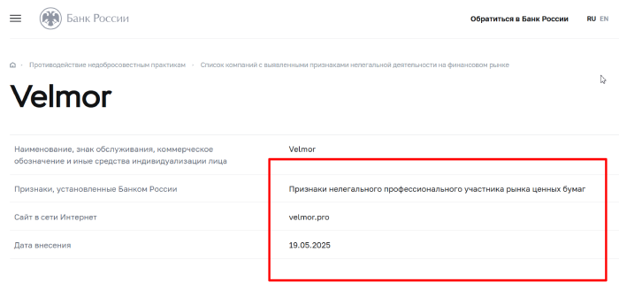 Примером фальшивого брокера, что обманывает обычное население, является проект Velmor. Это недавно созданный сайт, где даже нет актуальных контактных данных, но его продвигают, как престижную брокерскую компанию, работающую прозрачно и лицензировано. Правда, мошенники так и не рассказали, какую конкретно лицензию имеют.