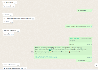 нормальный розговор был кончен начялись грубости — понятно что гопник вообще не юрист и просто хотел развести меня замарочить — даже не знаю разве стоит вносить того голубово в черный список завтра или после завтра он вернется с другой сказкой — хорошо бы было отметить как то такой вид мошенничества — для других — будьте остарожные»