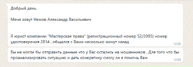 «Мошенник Немов Александр Васильевич юрист компании «Мастерская права» (регистрационный номер 52/2095) номер удостоверения 2814 позвонил мне и начал навязывать лапша на уши
