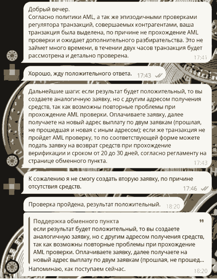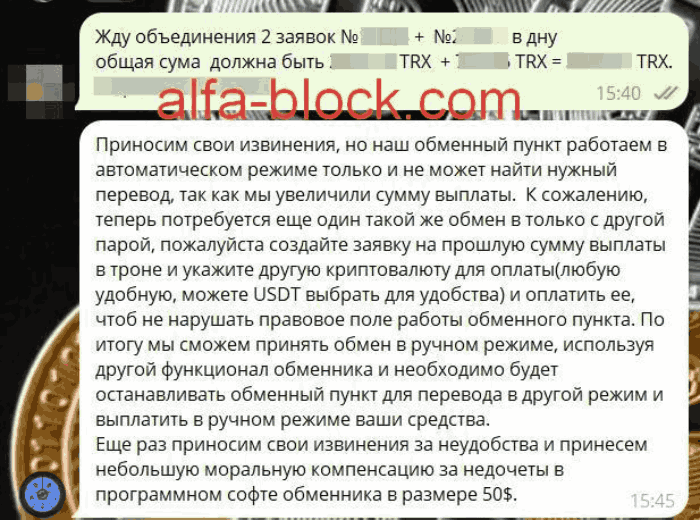 «Привет всем кто ищет информацию, а не мошенник ли этот человек скрывающийся под именем (Anonym P2P)скрин прилагаю. Этот нехороший человек, мне сложно назвать его нехорошим он просто гов…чел. Рассказывают про арбитраж связанный с криптовалютой. К нему на переписку в телеграмме можно попасть через бота, скрин прилагаю. Попался он на моём пути через группы связанные с поиском работы. Как было написано в описании, работа связана с покупкой криптовалютой за свои кровные соответственно и минимальная сумма 200$ (USDT). Схема такая, покупаешь 200USDT на bybit если у тебя есть аккаунт через Р2Р. На этой бирже за эти 200USDT покупаешь (TRX Tron) например и переводишь в тот обменник который он указывает, например alfa-block.com или ethsoft.org, в обменнике создаёшь заявку на обмен на ETH (ERC20), указываешь свой кошелёк на bybit куда обменник должен перевести и ждёшь процесс обмена 20-60 мин. После того как денюшка появилась на bybit продаёшь и имеешь 5% — 6% прибыли с одного круга обмена. Вот такая не очень тяжёлая работёнка. Один круг обменник конечно сделает а может и больше, у тебя загораются глаза от такой прибыли и думаешь а почему не увеличить сумму обмена скажем в 500USDT или даже 1000USDT чтоб прибыль была больше. И тут обменник блокирует твою заявку на обмен якобы твой перевод не прошёл проверку согласно политики AML скрин прилагаю. Техподдержка пишет что AML политику ты прошёл и так далее. Ну если ты решился сделать и вторую транзакцию всё же поверил что тебе разблокируют заявку, то мошенникам это только на руку. Не видать вам денег ни с 1 и не со 2 заявки, в телеграмме тебя блокируют и тут тебя осенило, ё-маё так меня что сейчас обманули, ну как то так.